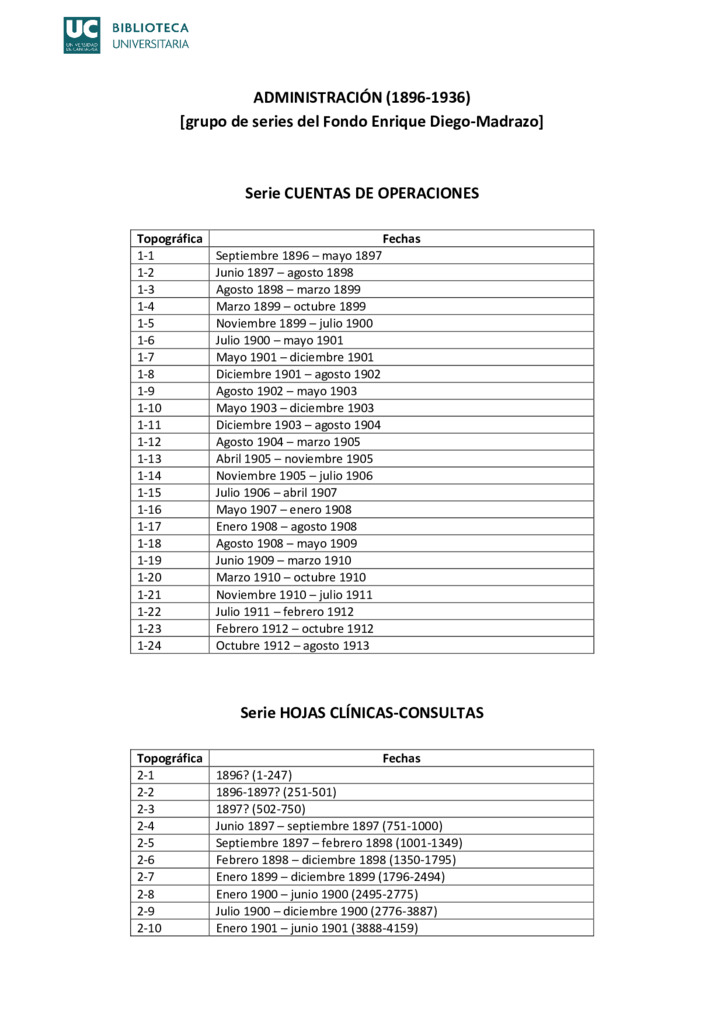 El fondo, recoge tanto la documentación relativa a la gestión del hospital en sus dos etapas y la correspondencia privada del doctor Madrazo entre 1896 y 1919.